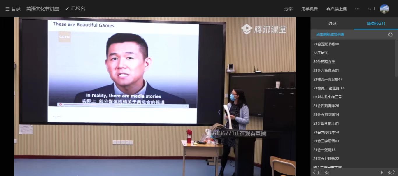 4月25日下午,第十三届“1+X证书VETS”杯英语文化节系列讲座第一讲“Together for a Shared Future—My Moments with Olympics(一起向未来——我的奥运记忆)”在1号教学楼第一和第二阶梯教室及腾讯课堂同时开讲。讲座由公共英语部教师刘玲主讲,青岛、泰安校区线上线下近1200人参加。