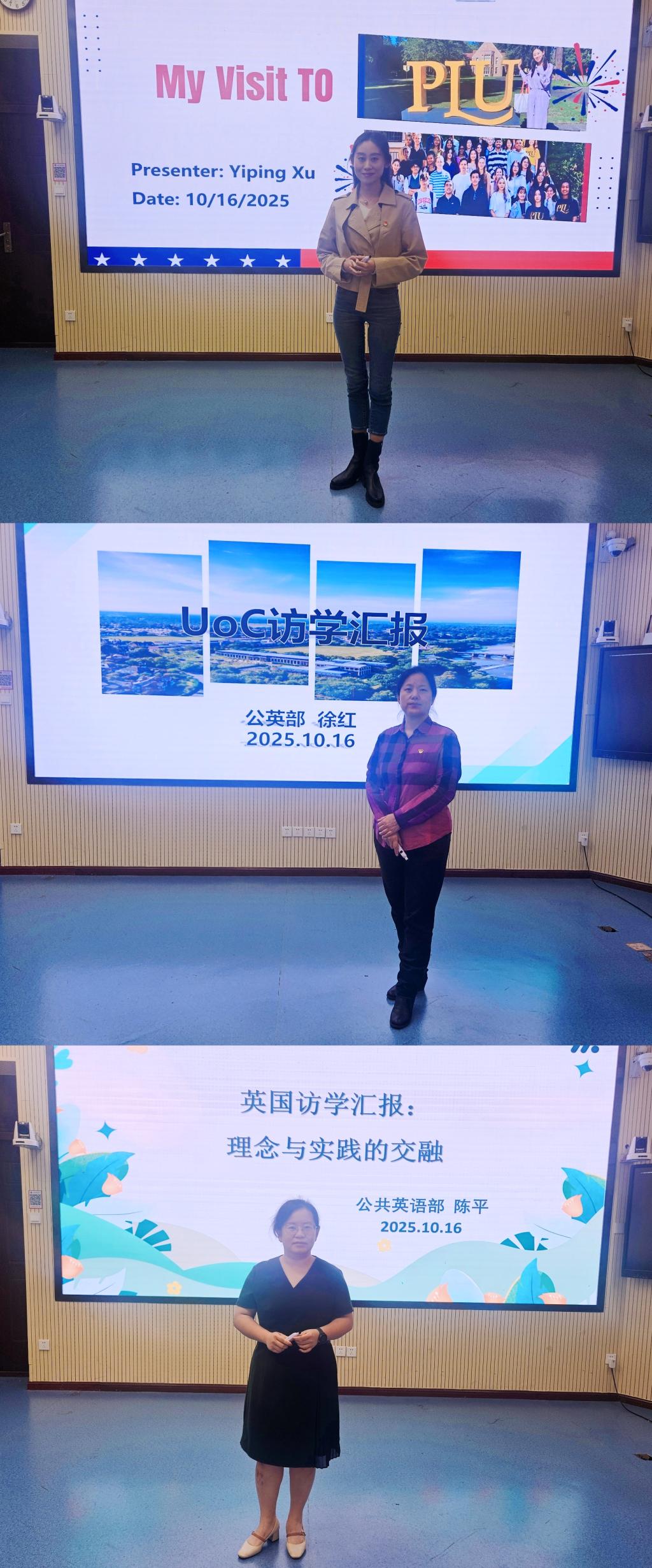 10月16日下午,公共英语部在1号教学楼第一阶梯教室举办部门教师国际访学汇报交流会。访学教师徐一萍、徐红和陈平分别做了汇报分享。部门全体教师参加。