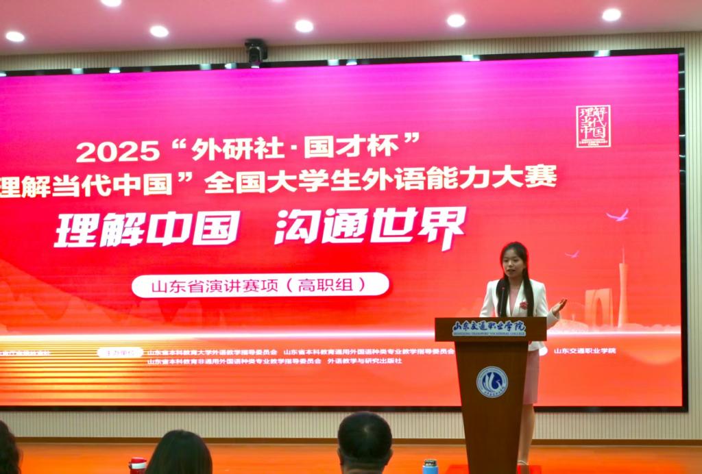 11月1日,2025“外研社·国才杯”“理解当代中国”全国大学生外语能力演讲大赛山东省省赛在山东交通职业学院举行。24旅游2班学生关瑜菲代表我院参赛,获得山东省赛区金奖。