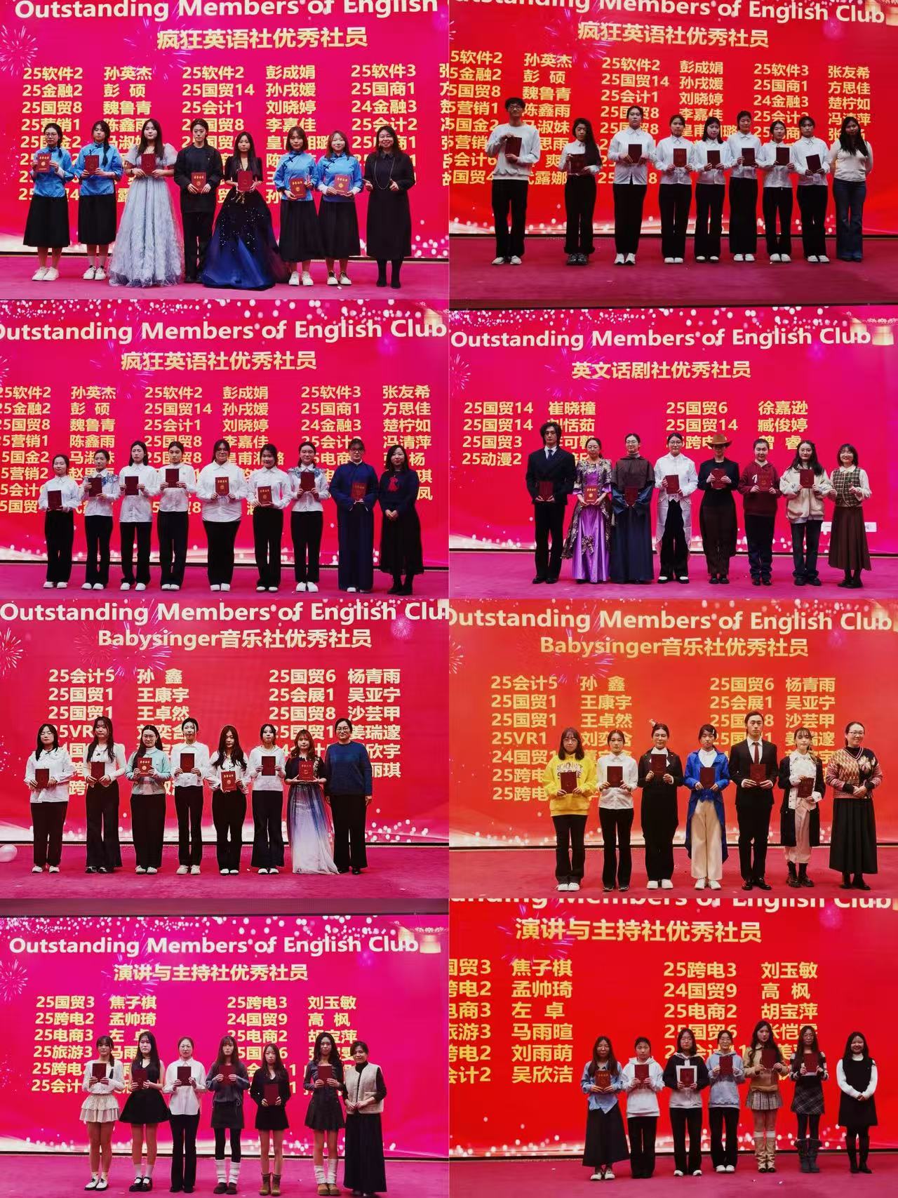 本次展演汇聚了俱乐部四个英语社团本学期活动的精彩成果。动感的开场和《Love Story》的深情演绎瞬间点燃了现场,轻松的游戏环节使气氛欢快热烈。疯狂英语社的英文诗朗诵《The Youth》讲述着学生们对青春的理解和愿景;英文话剧社社员声情并茂地复现了《傲慢与偏见》《寻梦环游记》两部经典作品,使观众在异域文化中沉浸式感悟人生;英文演讲与主持社的电影配音和朗诵《少年之心 远之大梦》用英语讲述了新一代青年的拳拳爱国心;Babysinger音乐社的音乐剧《汉密尔顿》片段以及《This is Me》小合唱更是将展演推向了高潮。活动中,英语俱乐部还对25国贸1班王康宇、25跨电2班刘雨萌等55名优秀社员进行了表彰。伴随着温情的精彩活动回顾和新年祝福,英语俱乐部2025年精品活动展演及本学年的社团活动圆满结束。