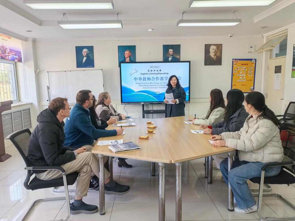 3月9日中午,公共英语部在外语村309教室召开新学期《英语听说》课程的中外教合作教学集体备课会。口语教研室主任宋琪、课程负责人苗兵以及参与本课程教学的中外教师参加会议。