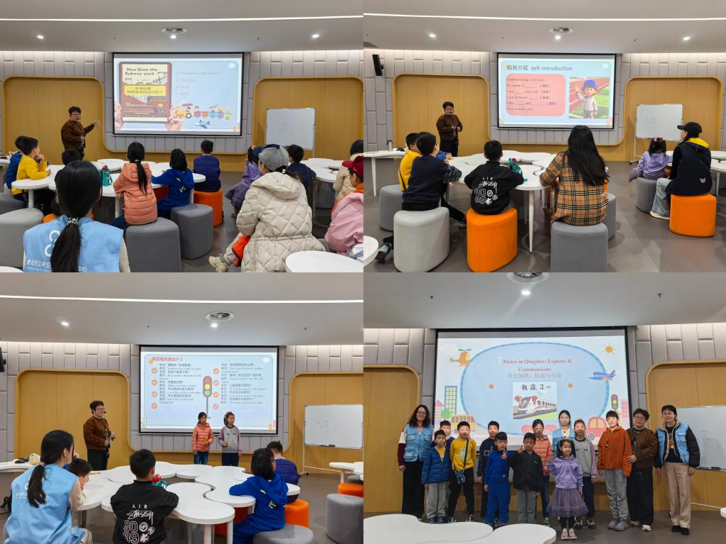 本次英语角主题“Metro in Qingdao: Explore & Communicate”系统介绍了青岛地铁的发展历程与运营特色。我院公共英语部教师孙静芳带领参与者解锁多元互动环节,从趣味盎然的地铁主题谜语竞猜,到紧张有序的单词拼读挑战与英语播报配音,再到“我为青岛地铁代言”迷你演讲,各环节兼顾趣味性与实用性,现场氛围热烈。参与者在轻松愉悦的互动中,精准掌握了搭乘地铁的实用英文表达,有效提升了英语应用能力。此外,活动还设置了青岛地铁特色视频观看、核心英文关键词学习、“地铁logo”创意作品制作等环节。参与者在实践操作中深化文明乘车理念,真切领略青岛地铁的便捷高效,对家乡城市发展的自豪感油然而生,互动热情持续高涨。